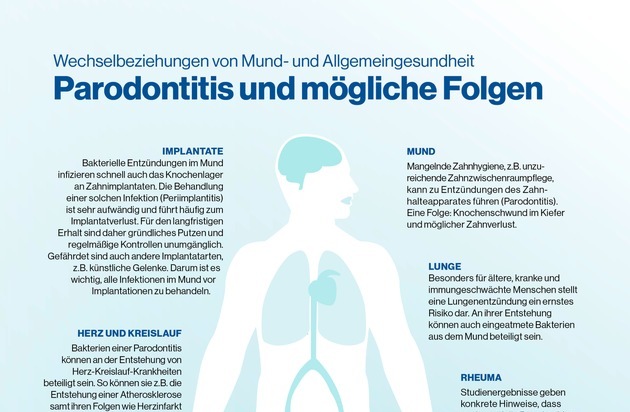 Die Parodontitis - früher Parodontose genannt - ist eine Entzündung, die den Zahnhalteapparat im Mund zerstört und damit unbehandelt zum Zahnverlust führt. Sie ist neben Karies die häufigste chronische Erkrankung des Menschen. Sie kann in verschiedenen Schweregraden an einzelnen oder allen Zähnen vorkommen. Dieselben Bakterien, die Parodontitis auslösen, aber auch ihre Stoffwechselprodukte, gelangen unter anderem auf dem Blutweg in entfernte Körperregionen. Und dort können sie weitere Abwehr- und Entzündungsvorgänge hervorrufen und beeinflussen.