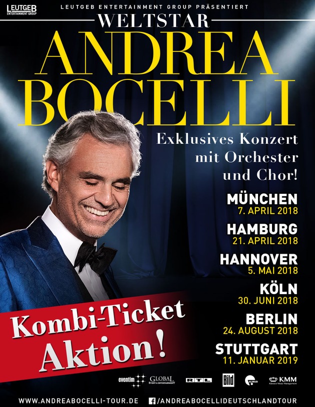 Im Rahmen seiner Deutschlandtournee gastiert der Startenor Andrea Bocelli am 07. April 2018 auch in der Olympiahalle München, die Besucher dürfen sich auf ein mit Sicherheit unvergessliches Konzerterlebnis freuen, bei dem der wohl beliebteste Tenor der Welt gemeinsam mit einem großen Symphonieorchester, einem fulminanten Chor, Tänzern und internationalen Gaststars bei einem genialen Mix aus Klassik, Musical und Film das Publikum in die Welt der Leidenschaft und Romantik entführen wird.