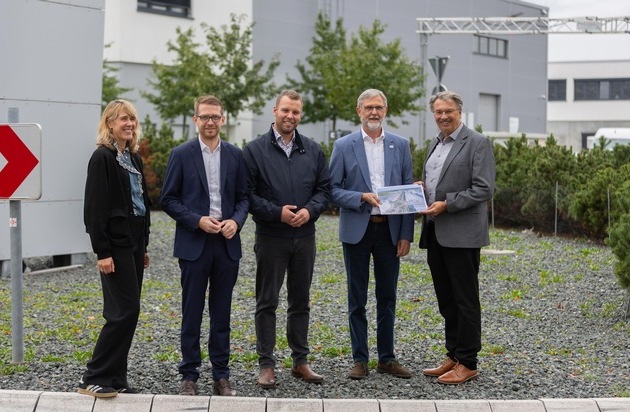 Bildunterschrift: Vorstellung des Projektes IB Green im Gewerbegebiet Mönchhof mit (v.l.) Dr. Anna-Christine Sander (Fachzentrum Klimawandel und Anpassung HLNUG), Michael Ruhl (Staatssekretär HMLU), David Rendel (Bürgermeister Stadt Raunheim), Prof. Dr. Thomas Schmid (Präsident HLNUG) und Manfred Ockel (Bürgermeister Stadt Kelsterbach).