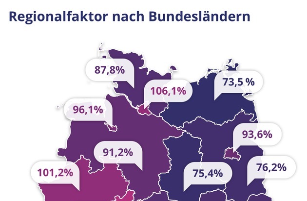 Der Bundesdurchschnitt ist der Mittelwert über die Gehaltsangaben aller Regionen und wird in der Auswertung mit 100 Prozent beschrieben. Anschließend werden die Mittelwerte je nach Bundesland ermittelt und diese mit dem Bundesdurchschnitt in Verhältnis gesetzt. Daraus ergeben sich Prozentwerte, die das Lohnniveau für die jeweiligen Bundesländer darstellen.