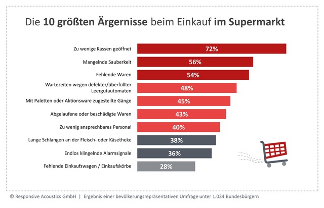 Der Gründonnerstag gehört für den Lebensmitteleinzelhandel zu den umsatzstärksten Tagen des Jahres. Und so werden die Bundesbürger auch Ende kommender Woche wieder die Supermärkte stürmen, um sich für die Oster-Feiertage einzudecken. Gerade an solchen Tagen werden die Schwächen vieler Supermärkte gnadenlos offengelegt. Was die Kunden bei ihren Einkäufen im Supermarkt am meisten Nerven kostet, wurde im Rahmen der bevölkerungsrepräsentativen Studie "Retail-Radar 2018" ermittelt. Das auf Klang- und Kommunikationskonzepte spezialisierte Start-up Responsive Acoustics (ReAct) hat dafür mehr als 1.000 Bundesbürger befragt.
