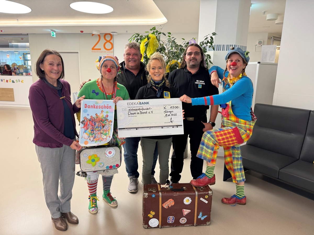 Tübingen/18.12.2025 – Der Verein Clowns im Dienst e.V. erhält eine Spende über 1.500 Euro von Mitarbeitenden von Edeka Südwest und ihren Produktionsbetrieben. Im Rahmen ihrer Initiative „Cent-Spende – Edeka Südwest hilft“ spenden diese den Cent-Betrag ihrer monatlichen Lohnabrechnung und unterstützen damit jedes Jahr etwa 20 soziale Organisationen und Aktionen.