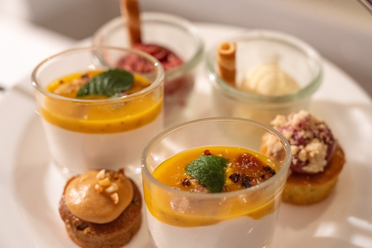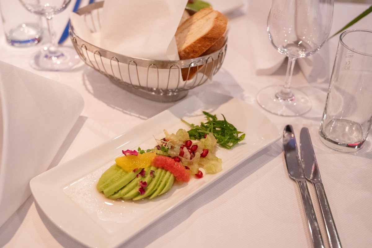 Während das Schiff gemächlich an der beleuchteten Frankfurter Skyline vorbeizieht, werden die Gäste kulinarisch verwöhnt: Die Vorspeise, eine marinierte Avocado mit Staudensellerie, Granatapfel und Grapefruit, wird direkt am Platz serviert. Anschließend lädt das reichhaltige Buffet zum Genießen ein: Kürbis-Kokossuppe mit karamellisierten Kürbiskernen, Brust und Keule von der Ente mit Zimt-Apfelrotkohl und Kartoffelklößen, Gewürz-Roastbeef mit Portwein-Jus, rotem Zwiebel-Chutney, confierten Karotten und Kartoffel-Selleriestampf, Zanderfilet mit Fenchel-Ingwer-Gemüse und Graupen-Risotto. Für Vegetarier steht gebratene Kräuter-Polenta mit Spinat, Kirschtomaten und Pilzen bereit. Abgerundet wird das Menü durch eine Auswahl an Desserts.