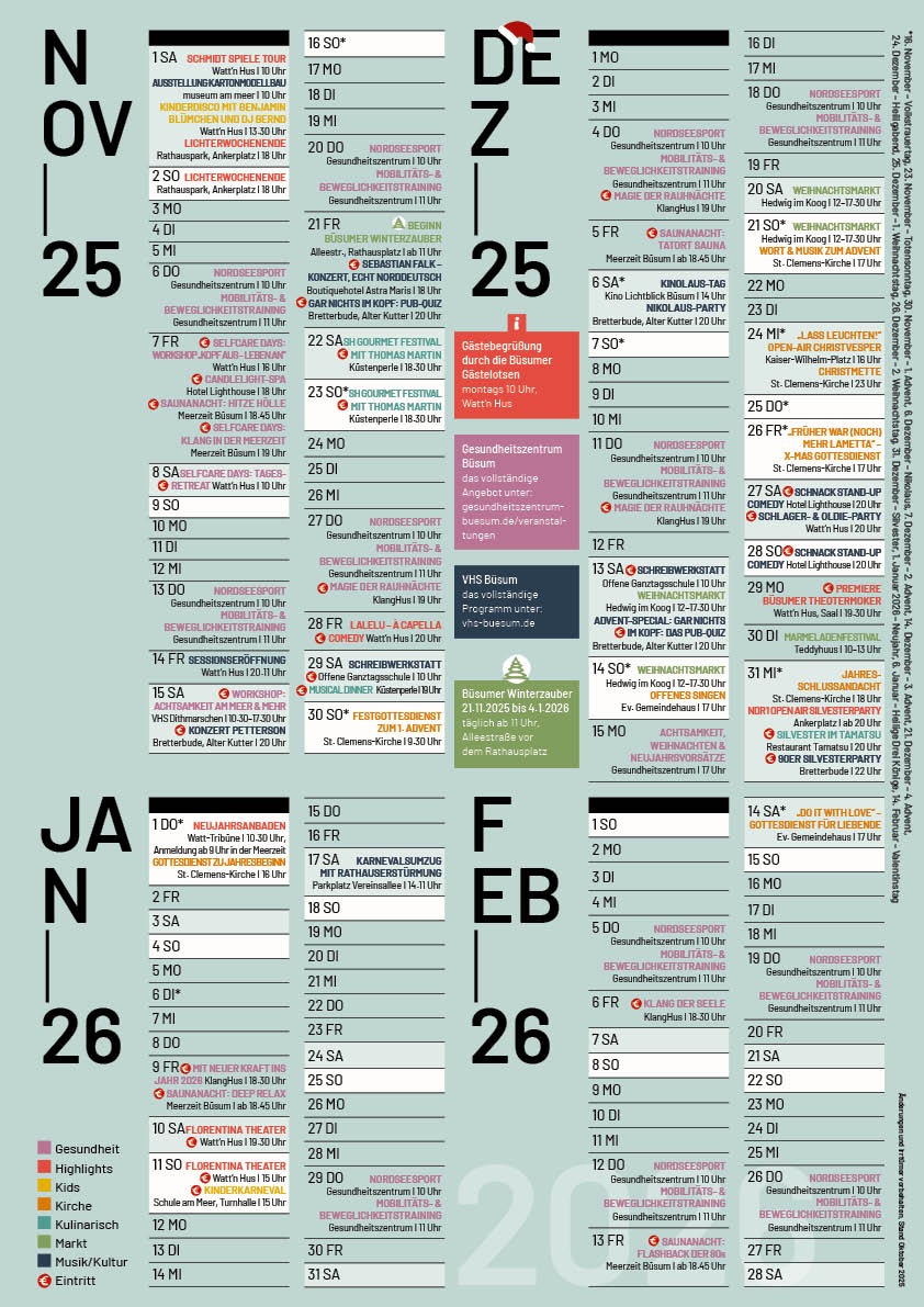 Von besinnlich bis beschwingt, von aktiv bis entspannend: Der Flyer bietet eine umfassende Übersicht über das Winterprogramm in Büsum, das sowohl Einheimische als auch Gäste anspricht. Ob Adventsromantik, kulturelle Highlights, Wellnessmomente oder Outdoor-Erlebnisse – für jede und jeden ist etwas dabei.