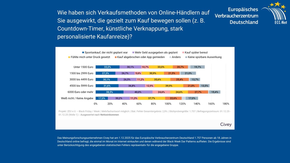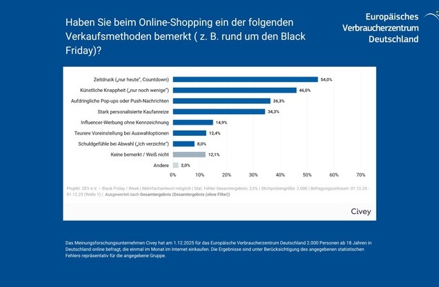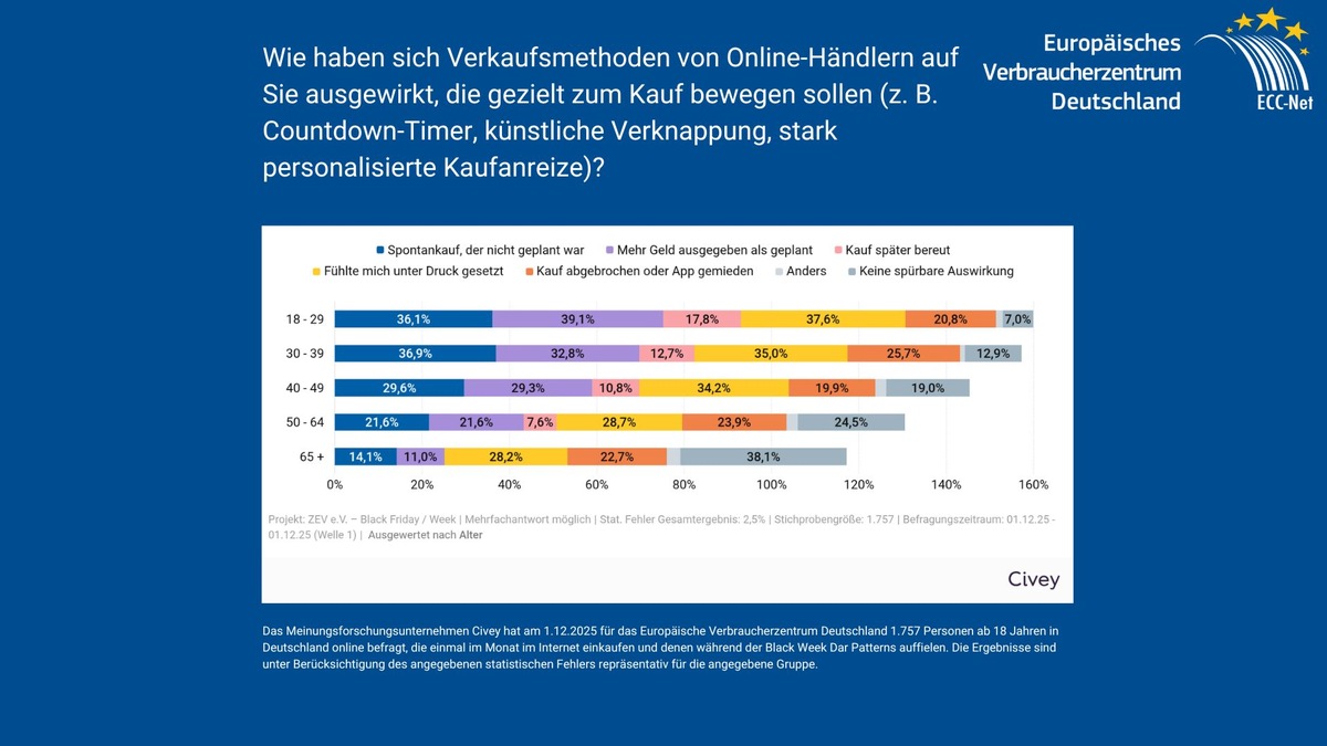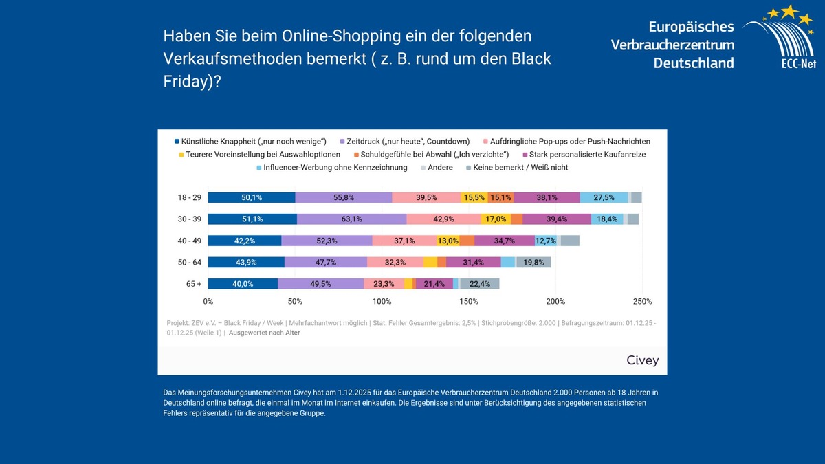 Das Meinungsforschungsunternehmen Civey hat am 1.12.2025 für das Europäische Verbraucherzentrum Deutschland 2.000 Personen ab 18 Jahren in Deutschland, die einmal im Monat im Internet einkaufen, online befragt. Die Ergebnisse sind unter Berücksichtigung eines statistischen Fehlers von 2,5 Prozent repräsentativ für die angegebene Gruppe.