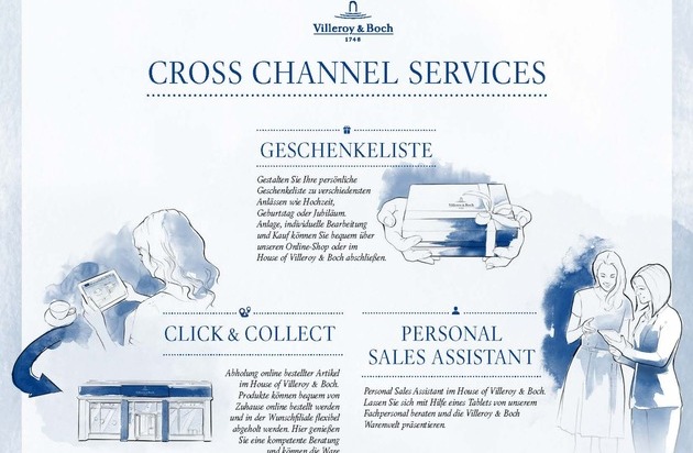 Der Personal Sales Assistant wird bereits seit Anfang 2015 in allen Villeroy & Boch Geschäften in Deutschland eingesetzt und soll in 2016 weltweit ausgerollt werden. Mit Hilfe eines Tablets kann das Verkaufspersonal im Kundengespräch auf Sortimente eingehen, die nicht am POS gezeigt werden. Darstellungen von einem komplett gedeckten Tisch, weitere Farb- und Dekorvarianten oder Dekorationsideen unterstützen die Mitarbeiterinnen und Mitarbeiter aktiv im Verkaufsgespräch. Auch die Verfügbarkeit einzelner Produkte oder Lieferzeiten lassen sich online einsehen. Ein weiterer Service ist die neue offline wie online nutzbare Geschenkeliste, die, und das ist neu und richtungsweisend für die Branche, die Offline-Liste im Geschäft mit dem E-Shop verknüpft und umgekehrt. Das heißt: Gäste können die Geschenke für das Hochzeitspaar oder das Geburtstagskind im Geschäft kaufen und dann nach Hause gesendet bekommen oder sie kaufen die Ware online ein und holen sie im Store ab.