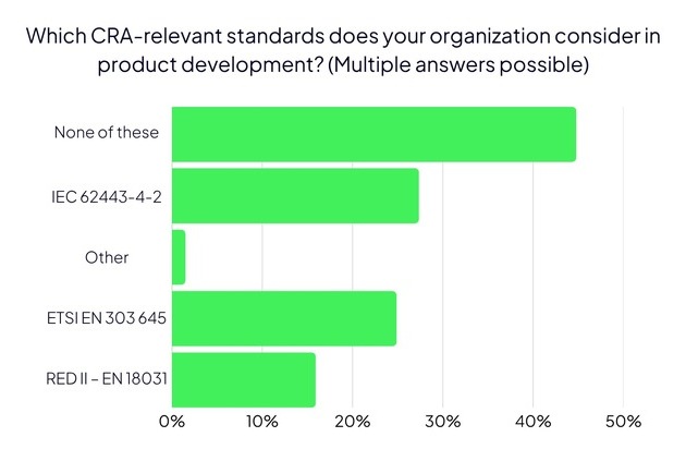 According to the ONEKEY report, a second standard essential to CRA compliance—ETSI EN 303 645—also receives little attention in product development. Only a quarter of the companies surveyed take this norm into account. ETSI EN 303 645 defines cybersecurity requirements for connected consumer devices to ensure baseline protection against cyberattacks.