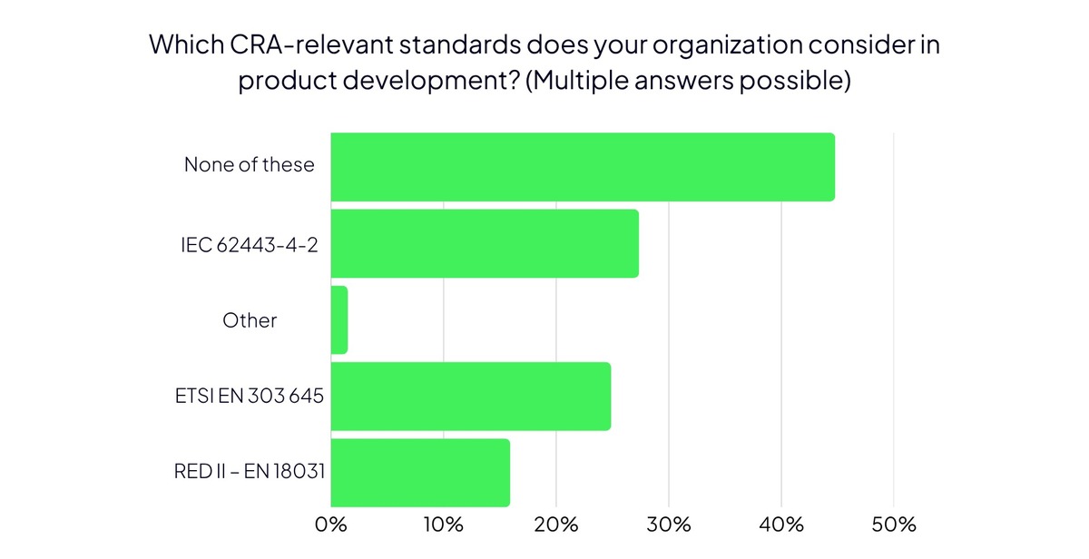 Only 27 percent of surveyed companies report aligning with IEC 62443-4-2, the standard that sets technical security requirements for components of industrial automation and control systems (IACS). IEC 62443-4-2 specifies measures for authentication, access control, system integrity, data confidentiality, and more—providing a practical framework to meet technical cybersecurity requirements. Wider adoption would help organisations build a solid basis for future CRA compliance.