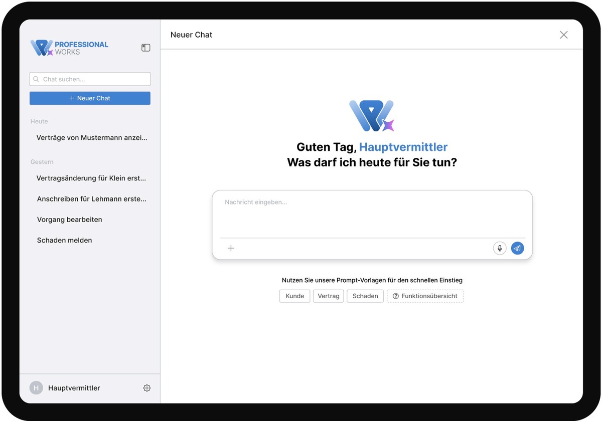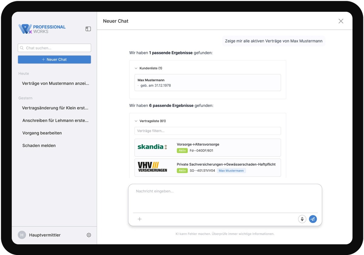 Zur DKM zeigt sich: Die Zukunft ist Realität. Der MVA ist nahtlos in Professional Works integriert und übernimmt bereits Aufgaben wie das Anlegen und Bearbeiten von Kunden oder Vorgängen sowie das Beantworten komplexer Fragen zu Dokumenteninhalten – etwa zu komplexen Bedingungswerken – im Dialog. Ab dem 29. Oktober steht PWX allen Nutzerinnen und Nutzern von Professional Works und somit allen Vermittlern der Fonds Finanz und des Deutschen Maklerverbunds kostenfrei zur Verfügung.