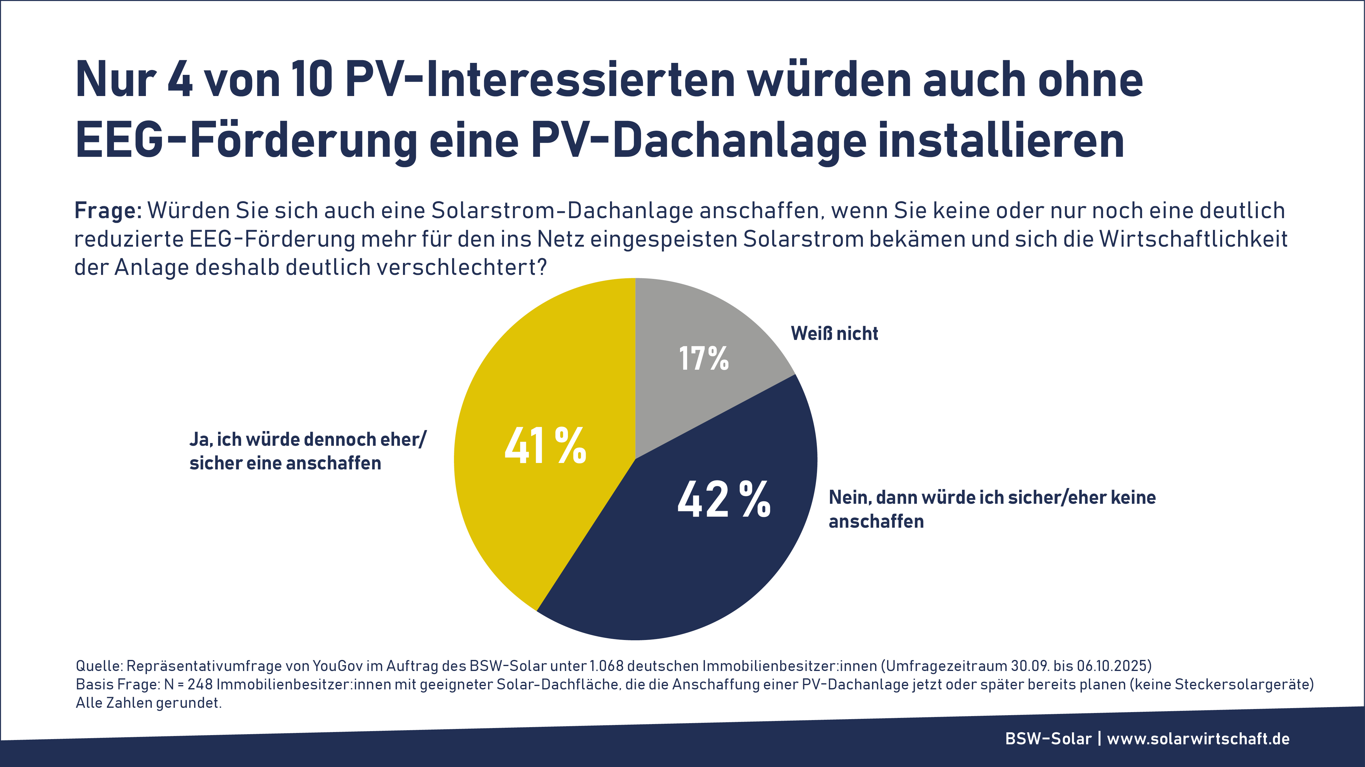 Eine Umfrage des BSW-Solar unter 132 Installationsbetrieben Ende letzten Jahres ergab, dass deren Einschätzung nach nur rund 4 von 10 Kund:innen im PV-Heimsegment auch ohne EEG-Förderung eine PV-Dachanlage anschaffen würden. Diese Einschätzung bestätigen jüngst Immobilienbesitzer:innen in einer YouGov-Repräsentativbefragung im BSW-Auftrag: Von 248 befragten Immobilienbesitzer:innen, die die Anschaffung einer PV-Dachanlage bereits planen, würden sich nur rund 4 von 10 (eher) auch bei wegfallender oder deutlich reduzierter EEG-Förderung weiterhin für den Kauf entscheiden. Ganz sicher würden laut der Umfrage in diesem Fall nur noch rund 12 Prozent eine PV-Dachanlage installieren.