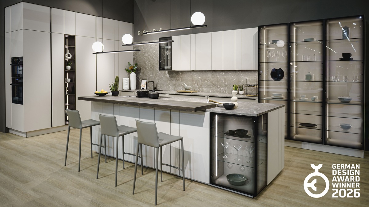 Die Dieter Knoll Küche ist ideal für offene Wohnkonzepte, in denen Kochen und Wohnen verschmelzen. Reduzierte Glaseckvitrinen mit elegantem Keramiksiebdruck setzen architektonische Akzente, während innovative Korpuslösungen maximale Gestaltungsfreiheit bieten.