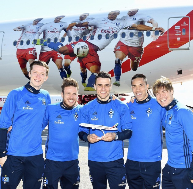 Am Dienstag präsentierte der langjährige HSV-Partner Emirates auf dem Hamburger Flughafen eine Boeing 777 im neuen HSV-Design. Das Flugzeug ist stellvertretend für die gesamte Mannschaft mit den Bildern der HSV-Profis Michael Gregoritsch, Gotoku Sakai, Filip Kostic, Bobby Wood und Nicolai Müller geschmückt.