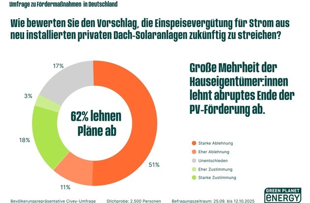 Hamburg, 20. Oktober 2025 – 62 Prozent der Eigenheimbesitzer:innen in Deutschland lehnen den Plan von Wirtschaftsministerin Reiche ab, die Solarförderung für Dächer zu streichen. Die Kritik zieht sich durch alle politischen Lager: Selbst unter Unions-Wähler:innen sind 55 Prozent dagegen. Das zeigt eine aktuelle, repräsentative Umfrage des Meinungsforschungsinstituts Civey im Auftrag des Ökostromanbieters Green Planet Energy.