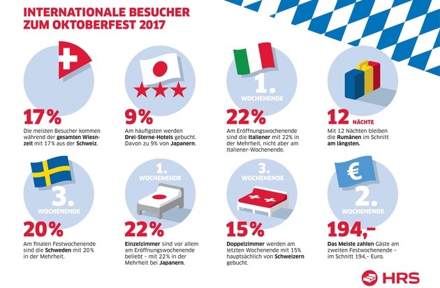 Zur Auswertung: HRS hat die Zimmerbuchungen nach Herkunftsländern während des Oktoberfestes in Münchener Hotels ausgewertet und die Top 10 als Errechnungsgrundlage genommen. Darüber hinaus wurden die durchschnittlichen Zimmerpreise im Vergleich zum Vorjahr errechnet. Betrachtungszeitraum: 15. September bis einschließlich 3. Oktober 2017. Der Stichtag für die Erhebungen war der 9. August 2017. In die Auswertung flossen alle bei HRS gebuchten Übernachtungen (Sternekategorien eins bis fünf, Doppelzimmer- und Einzelzimmerbuchungen, mit und ohne Frühstück).