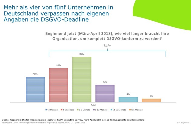 Die große Mehrheit der Unternehmen sieht sich noch nicht bereit für die EU-DSGVO (Europäische Datenschutz-Grundverordnung). Obwohl die Regulierung in einer Woche rechtsbindend wird, verfehlen durchschnittlich 85 Prozent der Firmen in den USA und Europa die Vorgaben der EU; in Deutschland sind es 81 Prozent. Eines von vier Unternehmen wird es sogar bis Jahresende nicht schaffen, regelkonform zu werden. Zu diesen und weiteren Ergebnissen kommt der neue Report von Capgemini, für den 1.000 Führungskräfte und 6.000 Verbraucher in acht Ländern und acht Branchen zu Fortschritten, Haltung und Möglichkeiten im Zusammenhang mit der DSGVO befragt wurden.