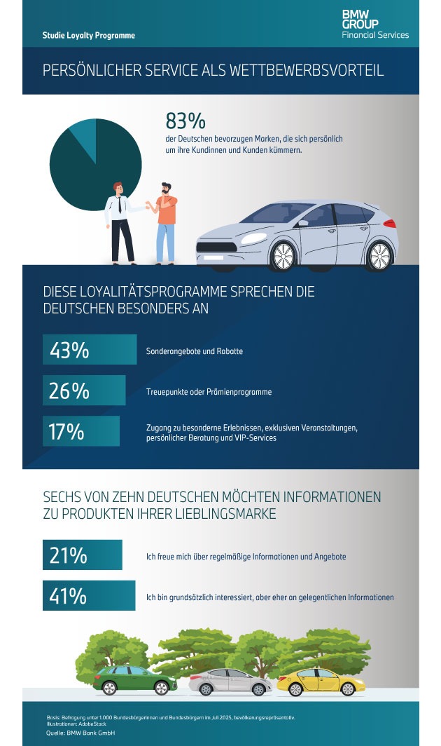 Nur Waren und Dienstleistungen zu verkaufen reicht heute nicht mehr aus: 82 Prozent der Deutschen sind der Meinung, dass gute Marken ihren Kundinnen und Kunden mehr bieten müssen. Unternehmen punkten insbesondere durch einen exzellenten Fokus auf den Kunden. 83 Prozent der befragten Bundesbürgerinnen und Bundesbürger bevorzugen Marken, die sich persönlich um ihre Kundschaft kümmern. Dabei haben Loyalitätsprogramme eine zentrale Bedeutung. Aus Sicht von 77 Prozent der Befragten zeigen Marken damit, dass ihnen die Beziehung zu Kundinnen und Kunden wichtig ist. Dies zeigen die Ergebnisse der repräsentativen Online-Umfrage "Loyalty Programme" im Auftrag der BMW Bank, für die im Juli 2025 insgesamt 1.000 Bundesbürgerinnen und -bürger befragt wurden.