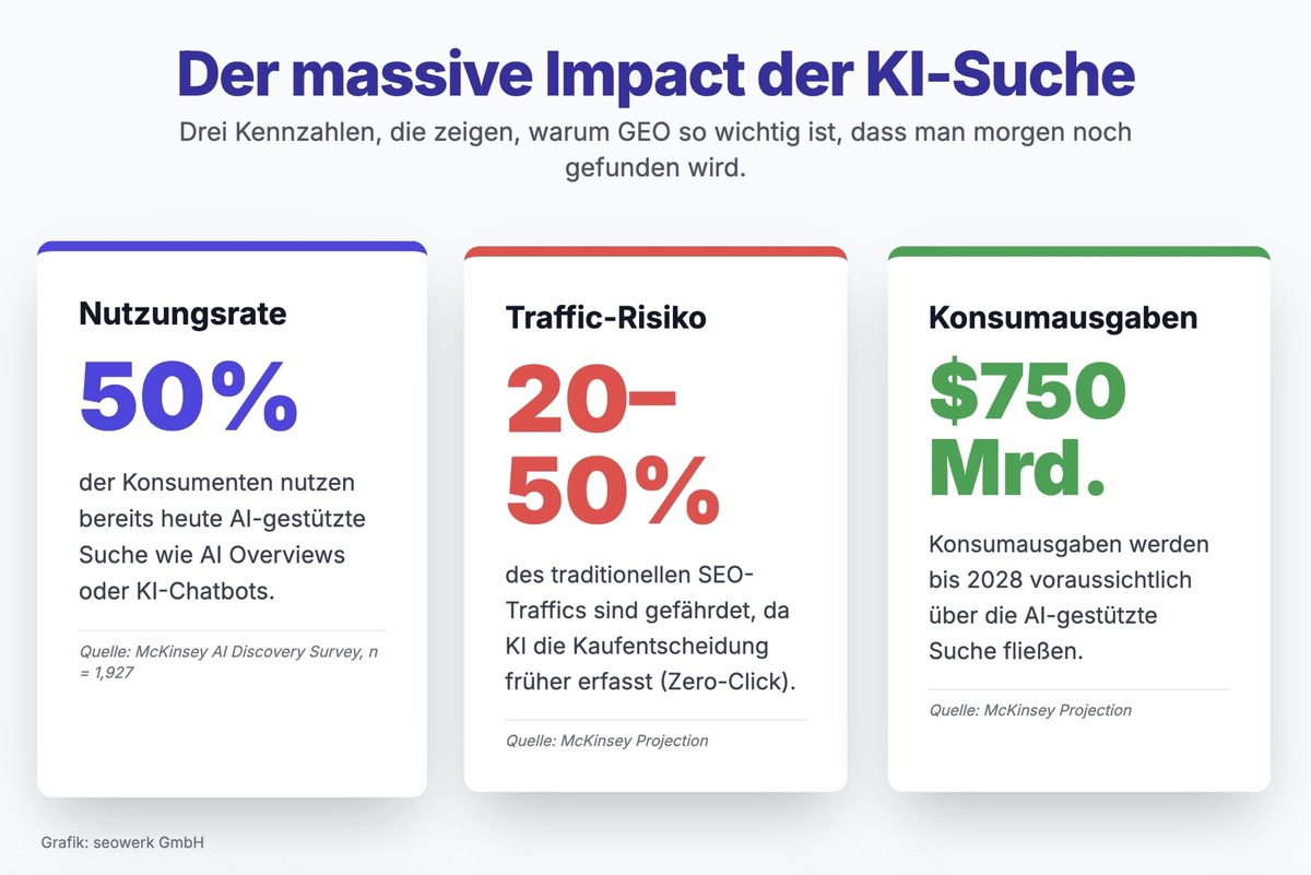 McKinsey warnt: Bis 2028 läuft die Hälfte aller Suchanfragen über KI. Wer nicht optimiert, verliert Sichtbarkeit.