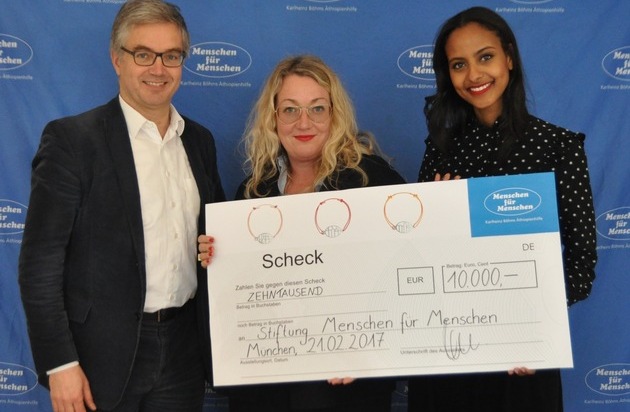 Eine Spende über 10.000 Euro erhielt am Dienstag (21.2.) die Stiftung Menschen für Menschen von der Schmuckdesignerin Julia Neumann vom Schmucklabel Chaingang (München). Die Spende nahm das Top-Model und Menschen für Menschen-Botschafterin Sara Nuru zusammen mit dem Vorstand der Stiftung, Dr. Sebastian Brandis, entgegen. "Wir sagen im Namen der Menschen in Äthiopien ein herzliches Dankeschön. Mit dem Geld können wir in unseren ländlichen Entwicklungsprojekten wieder vielen Kindern, Frauen und Männern ein kleines Stück mehr Hoffnung auf ein besseres Leben geben", sagte dazu Sebastian Brandis.
