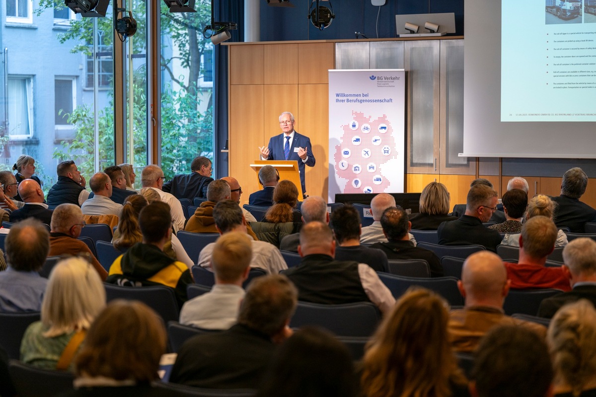 „Wir müssen bei den Unterweisungen wieder näher an die Beschäftigten rankommen.“ Diese Forderung stellte Wolfgang Witzke, Vorsitzender der Vertreterversammlung der BG Verkehr und langjähriger Ausbilder für Fahrpersonal beim Entsorger Remondis am Ende der Branchenkonferenz „Fahrpersonal unterweisen – Gamechanger für Sicherheit und Erfolg“. Zu der Veranstaltung hatte die BG Verkehr als zuständige Berufsgenossenschaft für die Verkehrsbranche gemeinsam mit der Sektion für Prävention im Transportwesen der Internationalen Vereinigung für Soziale Sicherheit (IVSS) eingeladen. Das Thema traf einen Nerv der Branche. Über 100 Teilnehmerinnen und Teilnehmer nahmen vor Ort in der Hauptverwaltung der BG Verkehr teil, 110 weitere hatten sich für eine Online-Teilnahme entschieden.