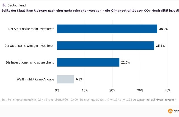 Methodik der Umfrage: Civey hat für die Stadtwerke Lübeck Gruppe GmbH vom 17.04. bis 21.04.2025 online 10.000 Bundesbürgerinnen und Bundesbürger ab 18 Jahren befragt. Die Ergebnisse sind aufgrund von Quotierungen und Gewichtungen repräsentativ unter Berücksichtigung des statistischen Fehlers von 2,5 Prozentpunkten beim jeweiligen Gesamtergebnis. Weitere Informationen zur Methodik finden Sie hier.