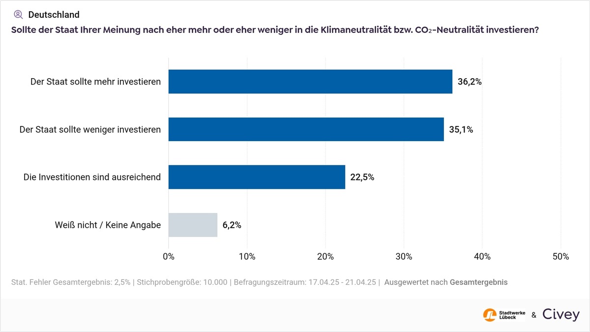 Die wirtschaftspolitische Herbstprojektion der Bundesregierung hat gezeigt: Die Energiewende bleibt ein zentraler Konjunkturmotor - doch der gesellschaftliche Rückhalt ist alles andere als einheitlich. Das bestätigt eine repräsentative Umfrage im Auftrag der Stadtwerke Lübeck Gruppe und des Meinungsforschungsinstituts Civey. Mehr als ein Drittel (36,2 %) der befragten Deutschen fordert darin mehr staatliche Investitionen in Klimaneutralität, während sich nahezu gleich viele (35,1 %) weniger Mittel wünschen. Nur etwa ein Fünftel (22,5 %) hält das aktuelle Niveau für ausreichend.