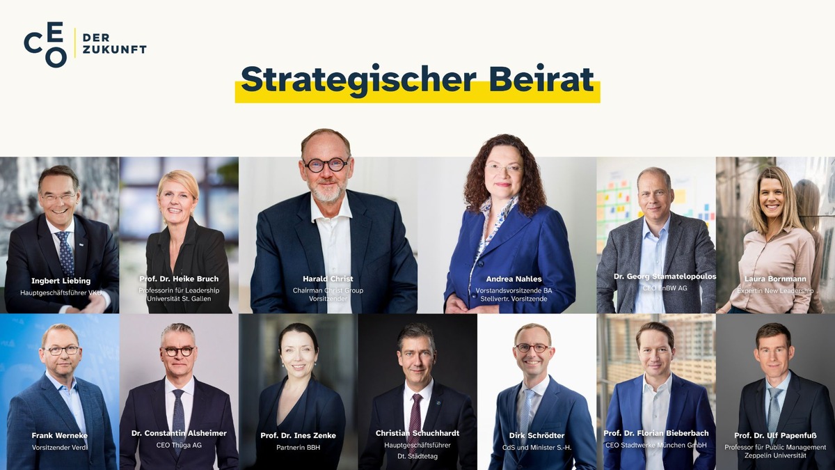 "CEO der Zukunft" ist eine bundesweite Initiative für die Kommunalwirtschaft mit dem Ziel, die besten Köpfe für die Branche zu gewinnen, um die anstehenden Wendethemen erfolgreich umzusetzen. Für den nun gebildeteten Strategischen Beirat als Kompass- und Impulsgeber übernimmt Harald Christ, Chairman von Christ Capital, den Vorsitz. Stellvertretende Vorsitzende wird Andrea Nahles, Vorstandsvorsitzende der Bundesagentur für Arbeit (BA). Ministerpräsident Daniel Günther (Schleswig-Holstein) übernimmt die Schirmherrschaft der Initiative.