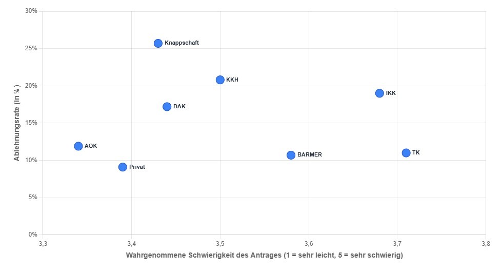 Ein überraschendes Detail der Analyse ist der fehlende Zusammenhang zwischen der „wahrgenommenen Schwierigkeit“ des Antrags und der Ablehnung. Die Techniker Krankenkasse wird von Nutzern oft als bürokratisch und schwierig im Antragsprozess empfunden – hat aber eine der niedrigsten Ablehnungsraten. Die Interpretation der Experten: Ein strenger Prozess zwingt zur Vollständigkeit der Unterlagen, was Rückfragen und pauschale Ablehnungen im Nachgang verhindert. Das Gegenbeispiel liefert die Knappschaft: Hier trifft eine mittlere Prozess-Schwierigkeit auf die höchste Ablehnungsquote – für den Versicherten das ungünstigste Szenario.
