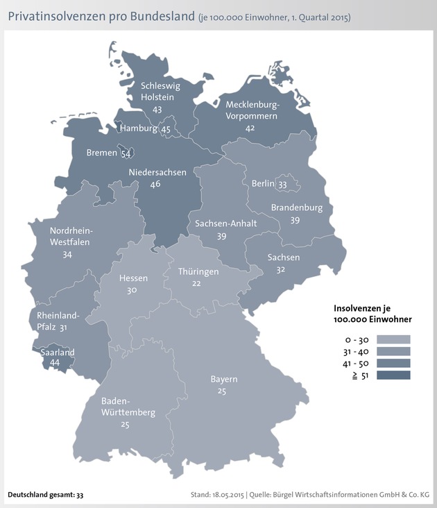 Bei allen positiven Nachrichten ist jedoch zu beachten, dass durch private Insolvenzen den Gläubigern Schäden in Milliardenhöhe entstehen. Bereits in den ersten drei Monaten des Jahres 2015 übersprangen die Forderungsausfälle die Milliardengrenze. Wie schon in den vergangenen Jahren werden im Norden der Republik mehr Privatinsolvenzen angemeldet als im Süden. Am meisten Privatinsolvenzen gab es mit 54 Fällen je 100.000 Einwohner in Bremen. Es folgen Niedersachsen (46 Privatinsolvenzen je 100.000 Einwohner) und Hamburg (45). Über dem Bundesdurchschnitt von 33 Privatinsolvenzen je 100.000 Einwohner liegen auch das Saarland (44), Schleswig-Holstein (43), Mecklenburg-Vorpommern (42), Sachsen-Anhalt und Brandenburg (je 39) sowie Nordrhein-Westfalen (34). Erstmals gab es in Thüringen die wenigsten Insolvenzen. Lediglich 22 von 100.000 Einwohnern mussten eine Privatinsolvenz anmelden. Geringe Werte meldeten ebenfalls Baden-Württemberg und Bayern (je 25). Bei der absoluten Betrachtung der Zahlen stehen die bevölkerungsreichen Bundesländer an der Spitze. Allen voran Nordrhein-Westfalen mit 5.982 Insolvenzen. Es folgen Niedersachsen (3.592), Bayern (3.140) und Baden-Württemberg (2.676).