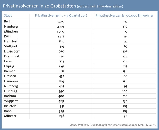 Die aktuelle Analyse zeigt auch, dass Privatinsolvenzen eher ein Thema in deutschen Großstädten sind. So liegt die Insolvenzquote in lediglich fünf der 20 einwohnerstärksten Städte unter dem Durchschnitt. Die wenigsten Verbraucherinsolvenzen, bezogen auf das Stadt-Ranking, wurden demnach in Stuttgart (67 Insolvenzen je 100.000 Einwohner) angemeldet. Führend in der Auswertung sind Hannover und Bremen mit 156 Insolvenzen je 100.000 Einwohner. Auch in Wuppertal (134), Hamburg (130), Essen und Dortmund (je 124) und Leipzig (123) liegt die Insolvenzquote deutlich über dem bundesweiten Durchschnitt.