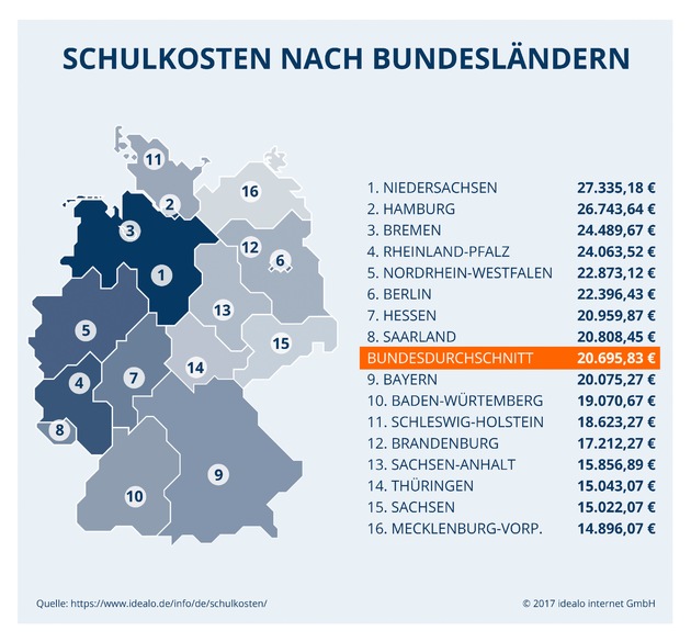 Betrachtet man die durchschnittlichen Kosten für ein Schulkind von der Einschulung bis zum Abitur je Bundesland sind extreme Schwankungen zu erkennen. Die Gründe dafür liegen in der föderalistischen Struktur Deutschlands. Es lassen sich dementsprechend keine allgemeinen Aussagen darüber treffen, ob der Süden, Norden, Osten oder Westen teurer bzw. günstiger ist. Die größten materiellen Investitionen sind Rucksäcke, Sportbekleidung und Arbeitsmittel wie Taschenrechner, Hefte und Schreibutensilien - hier empfiehlt sich das Vergleichen von Preisen auf www.idealo.de, denn das Vergleichs- und Shoppingportal verfügt über ein großes Repertoire an Schulzubehör.