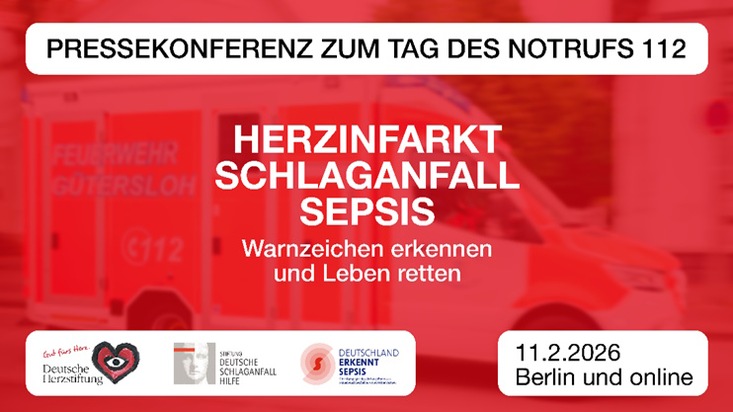 Viele Tausende Fälle von chronischer Herzinsuffizienz und Invalidität als Spätfolgen sowie Todesfälle wären vermeidbar, wenn Betroffene und Ersthelfer Vorboten, Symptome und die häufigsten Ursachen dieser Komplikationen kennen würden, um schnell richtig reagieren zu können, indem sie mit dem Notruf 112 den Rettungsdienst alarmieren. Auf der Pressekonferenz anlässlich des Tags des Notrufs 112 am 11.2.2026 informieren Expert:innen des Aktionsbündnisses Patientensicherheit e. V., der Deutschen Herzstiftung und der Stiftung Deutsche Schlaganfall-Hilfe über die wichtigsten notfallrelevanten Themen dieser drei lebensbedrohlichen Komplikationen, zum Beispiel zu Fragen wie: