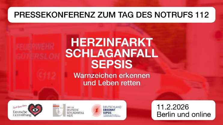 Wir laden Sie zur Hybrid-Pressekonferenz zum Tag des Notrufs 112 „Herzinfarkt, Schlaganfall, Sepsis – Warnzeichen erkennen und Leben retten“ vor Ort oder per Livestream ein.