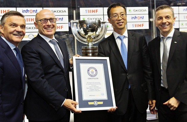 Den Vertrag zur Verlängerung der Partnerschaft präsentierten SKODA Vorstandsvorsitzender Bernhard Maier, IIHF Präsident Dr. René Fasel sowie Präsident und CEO von Infront Sports & Media Philippe Blatter am Freitag in der Lanxess Arena in Köln - wo sich am 21. Mai entscheidet, welches Team die 2017 IIHF Eishockey-Weltmeisterschaft gewinnt. Ebenfalls vor Ort war ein Juror von Guinness World Record, der den neuen Weltrekord für das längste WM-Sportsponsoring bestätigt hat - die nun 25-jährige Partnerschaft von SKODA mit der IIHF.