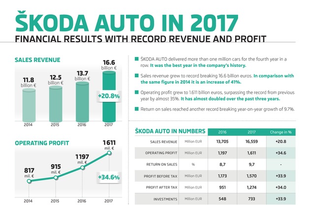 Im Geschäftsjahr 2017 erreichte SKODA AUTO bei Umsatz und Ergebnis neue Bestwerte. Der Umsatz ist auf 16,559 Milliarden Euro (2016: 13,705 Milliarden Euro) gestiegen und übertraf damit den bisherigen Rekordwert von 2016 um 20,8 Prozent. Das Operative Ergebnis legte um 34,6 Prozent auf 1,611 Milliarden Euro (2016: 1,197 Milliarden Euro) zu. Das entspricht 9,7 Prozent des Umsatzes (2016: 8,7 Prozent).