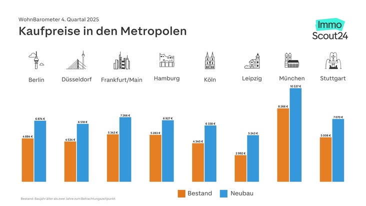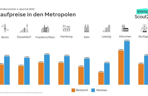 Das ImmoScout24 WohnBarometer ist der Marktreport zur Entwicklung des Immobilienmarkts. Herausgeber ist ImmoScout24: Deutschlands führende Online-Plattform für Wohnimmobilien. Das ImmoScout24 WohnBarometer gibt die Preisentwicklung in realen Angebotspreisen wieder. Die Datenbasis umfasst über 8,5 Millionen Inserate der letzten fünf Jahre auf ImmoScout24. Die Werte werden für Referenzobjekte für den jeweils betrachteten Immobilientyp durch einen Algorithmus aus dem Bereich des maschinellen Lernens ermittelt. Für Wohnungen zum Kauf wird eine Drei-Zimmer-Wohnung mit 80 Quadratmetern Wohnfläche zugrunde gelegt. Das betrachtete Einfamilienhaus hat 140 Quadratmeter Wohnfläche und einen Grundstücksanteil von 600 Quadratmetern. Die Kategorie Neubau enthält alle Angebote mit einem Baualter von maximal zwei Jahren zum jeweiligen Bestimmungszeitpunkt. Die aktuellen Angebotskaufpreise beziehen sich immer auf den letzten Datenpunkt im Marktreport und stehen damit für den Angebotspreis im vierten Quartal 2025.
