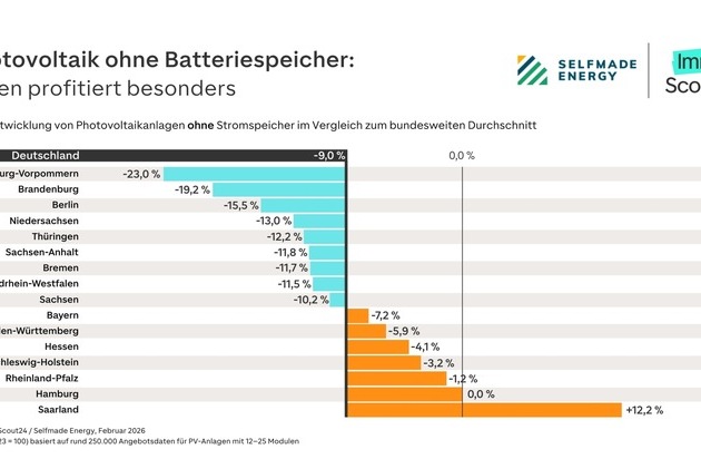 In Mecklenburg-Vorpommern kosten Komplettanlagen ein Drittel weniger als noch vor einem Jahr (–36,8 Prozent). Auch in Thüringen (–27,3 Prozent) und Baden-Württemberg (–25,5 Prozent) zeigt sich eine ausgeprägte Preisreduktion. Bei Komplettsystemen fällt der Rückgang im Saarland mit –1,5 Prozent deutlich schwächer aus als im Bundesdurchschnitt.