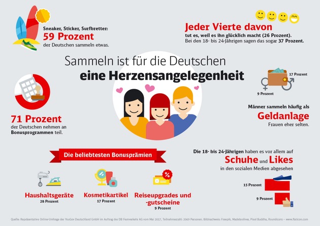 Repräsentative Umfrage von Deutscher Bahn und YouGov belegt Sammelleidenschaft der Deutschen - Die Mehrheit der Deutschen sammelt aktiv - Ein Viertel der befragten Sammler macht Sammeln sogar glücklich - Insbesondere Männer sehen darin eine Form der Geldanlage - Beim Einkaufen oder der Ticket-Buchung werden zudem Bonuspunkte angehäuft