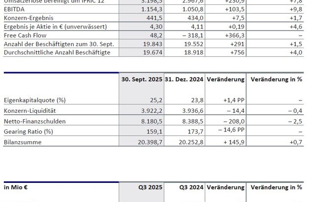 Das Konzern-Ergebnis lag nach neun Monaten mit 1,7 Prozent leicht im Plus bei 442 Millionen Euro. Ausschlaggebend für das geringe Wachstum waren steigende Zinsaufwendungen gepaart mit negativen Wechselkurseffekten und latenten Steuern in der Berichtsperiode. Das unverwässerte Ergebnis je Aktie stieg auf 4,30 Euro (9M 2024: 4,11 Euro).