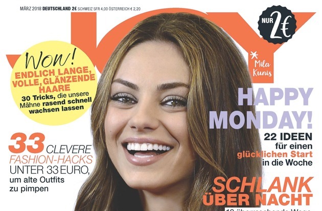 Der Name ist Programm, denn JOY setzt Trends und macht gute Laune. Das Magazin begeistert moderne und dynamische Frauen mit einem einzigartigen Themenmix, der immer wieder auf außergewöhnliche und erfrischend andere Weise in Szene gesetzt wird. In lebendiger Optik präsentieren sich die raffiniertesten Beauty-Looks, die hippsten Fashion-Trends sowie die spannendsten People Stories. Experimentier- und konsumfreudige JOY-Frauen lieben es, sich selbst immer wieder neu zu inszenieren und setzen deshalb auf die hohe Trendkompetenz von JOY! Der große Erfolg von JOY wurde Grundlage für die Internationalisierung des Trendmagazins, das mittlerweile in sieben Ländern erfolgreich erscheint.