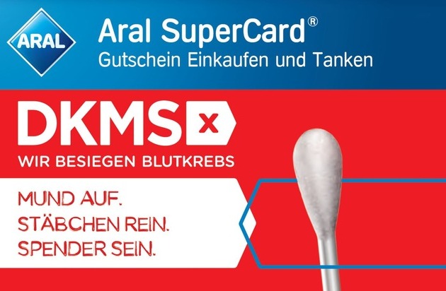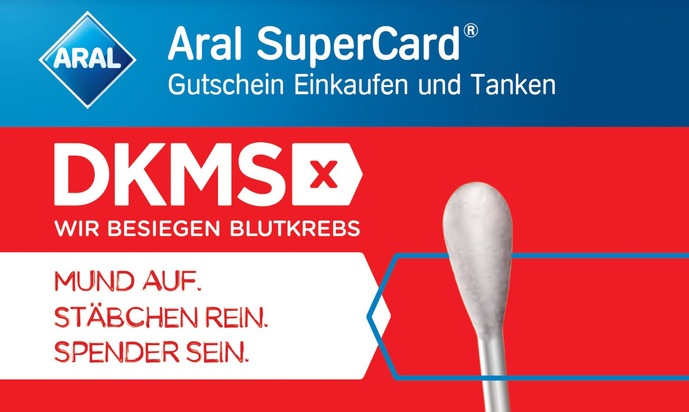 Ab sofort bietet Aral im deutschen Tankstellennetz eine neue Ausgabe der Aral SuperCard an. Sie ist mit dem Logo der DKMS und dem Aufruf "Mund auf. Stäbchen rein. Spender sein." versehen.