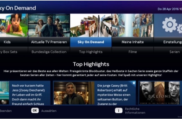 Kombi-Angebot für Sky und EntertainTV28. April 2016 - In Kürze kommen noch mehr Kunden in den Genuss der Vorzüge von Sky On Demand. Denn pünktlich zur Markteinführung des neuen EntertainTV-Angebots der Deutschen Telekom am 2. Mai kann Sky On Demand auf dem neuen Media Receiver genutzt werden. Damit bekommen EntertainTV-Kunden bei Abschluss eines Sky Abonnements ohne Zusatzkosten Zugang zu ihrem Sky Programm auf Abruf. Das bedeutet: Tausende Inhalte jederzeit auf Knopfdruck inklusive der aktuellsten Filme wie "Mad Max: Fury Road", "Miss Bodyguard - In High Heels auf der Flucht" und "Ant-Man" (ab 15.5.), die neuesten Staffeln von Serienhits wie "Game of Thrones", "Billions" und "Vinyl" sowie Sky Eigenproduktionen wie "The Last Panthers" und "Gomorrha". Hinzu kommen hochwertige Dokumentationen, zahlreiche Kindersendungen, exklusive Sporthighlights sowie die Bundesliga Collection auf Abruf - und das alles ohne Werbeunterbrechung.