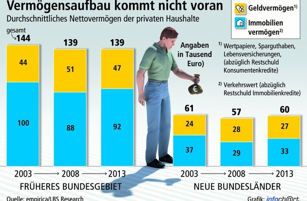 Den Auswertungen zufolge besitzt der durchschnittliche Haushalt im früheren Bundesgebiet ein Gesamtvermögen von 170.000 Euro. Abzüglich der Schulden in Höhe von im Schnitt 31.000 Euro (überwiegend Immobilienkredite) verbleibt ein Nettovermögen von durchschnittlich 139.000 Euro, exakt so viel wie im Jahr 2008 und 5.000 Euro weniger als vor zehn Jahren, so LBS Research. In den neuen Ländern liegt das Nettovermögen mit im Schnitt 60.000 Euro um mehr als die Hälfte niedriger als im Westen. Auch im Osten sind die Menschen in den zurückliegenden zehn Jahren nicht reicher geworden. Vor zehn Jahren betrug das Durchschnittsvermögen hier 61.000 Euro (vgl. Grafik).