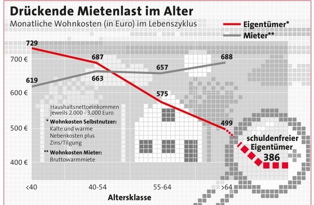Während der Mieter in jungen Jahren ca. ein Viertel seines Einkommens für eine warme Wohnung ausgibt, muss der Selbstnutzer anfangs jeden dritten Euro für das Wohnen aufwenden und sich gegenüber dem Mieter im Konsum entsprechend einschränken. Aber schon in der Familienphase (40 bis 54 Jahre) gleicht seine Belastung derjenigen des Mieters; beide Gruppen geben dann etwa ein Viertel ihres Einkommens für das Wohnen aus. In den Folgejahren öffnet sich die Schere dann weiter zu Gunsten des Eigentümers. Schuldenfreie Selbstnutzer geben im Ruhestand nur noch jeden sechsten Euro, also 16 Prozent ihres Einkommens für das Wohnen aus, was letztlich nur noch die eigentlichen Wohnnebenkosten (Energiekosten, Reparaturen, "kalte" Nebenkosten wie z. B. Straßenreinigung) umfasst. Bei Mieterhaushalten dagegen beanspruchen die Wohnkosten in Form der Bruttowarmmiete fast ein Drittel des Haushaltsbudgets.