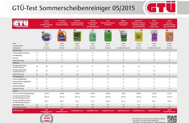 Auf den Plätzen mit dem GTÜ-Siegel "empfehlenswert" landeten die beiden besonders preiswerten Autosol Scheibenreiniger gebrauchsfertig und Kerndl Scheibenklar Sommer gebrauchsfertig jeweils im 5-Liter-Kanister für rund drei beziehungsweise rund zwei Euro, gefolgt vom tankstellen-typisch-teuren Aral KlareSicht Sommer Fertigmix (3 Liter für knapp 9 EUR) sowie Nigrin Scheibenklar Fertigmix (2 Liter für gut 3 EUR), Robbyrob Klarblick Sommer-Scheibenreiniger gebrauchsfertig (5 Liter für knapp 3 EUR) und Shell Screenwash summer ready to use (2 Liter für knapp 5 EUR). Schlusslicht ist der von der GTÜ als "nicht empfehlenswert" eingestufte Total Sommer Scheibenreiniger gebrauchsfertig (4 Liter für knapp 9 EUR) mit deutlichen Mängeln beim Lösen der sommertypischen Schmutzarten.