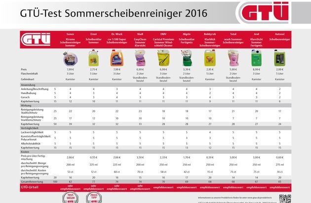 Die GTÜ Gesellschaft für Technische Überwachung hat gemeinsam mit Auto Bild zehn aktuelle Sommer-Fertigmischungen auf ihre Leistungsfähigkeit hin getestet. Testsieger mit dem Prädikat "sehr empfehlenswert" wurde Sonax Xtreme Scheibenreiniger Sommer im Dreilitergebinde zum Preis von knapp acht Euro. Auf Platz 2 Scheibenklar Sommer gebrauchsfertig von Ernst im 5-Liter-Kanister zu 2 Euro 75. Das billigste Produkt im Test schnitt ebenfalls mit einer überdurchschnittlichen Reinigungsleistung als "sehr empfehlenswert" ab. Das belohnten die GTÜ-Prüfer mit dem Siegel "Preis-Leistungssieger".