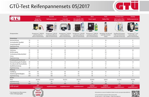 Auf den weiteren Plätzen folgen drei empfehlenswerte Pannensets, nämlich das Reifenpannenset von Elastofit sowie das 1-2-Go Kit 2 Step Tire Repair von Terra-S und Pannex - Die schnelle Hilfe bei Reifenpannen. Alle drei setzen ebenfalls auf die Kombination Kompressor und Dichtmittel wie auch das von den GTÜ-Testern als "bedingt empfehlenswert" eingestufte Smart repair von slime. Als ebenso "bedingt empfehlenswert" erwies sich der Reifen Pilot von Holts mit seiner klassischen Aerosol-Spraydose, die den defekten Reifen gleichzeitig mit Dichtmittel und Druck versorgen soll. Das AIO Comfort Plus Reifendichtmittel von Premium-Seal und Dunlops Reifenreparaturset erfüllten die Testkriterien nicht. Im Fall von Premium-Seal blockierte bei mehrfachen Versuchen jedes Mal nach wenigen Sekunden die Dichtmittelzufuhr, so dass sich der Reifen überhaupt nicht befüllen ließ und bei Dunlop reichte der maximale Druckaufbau von 0,6 bar schlicht nicht aus, um die Testfahrt antreten zu können.