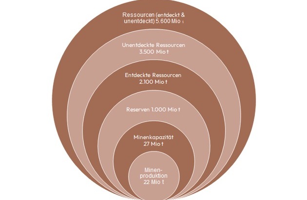 Insgesamt haben sich die bekannten Kupfervorkommen und damit auch die Kupferreserven im Laufe der Jahre ständig vergrößert. Man geht davon aus, dass sich dieser Trend auch in Zukunft fortsetzen wird. USGS-Daten zufolge sind seit 1950 im Durchschnitt immer 40 Jahre Kupferreserven und über 200 Jahre Kupferressourcen verfügbar. Diese beinhalten Reserven, entdeckte und potenziell profitable Lagerstätten und unentdeckte Lagerstätten, die auf der Grundlage vorläufiger geologischer Untersuchungen vorhergesagt wurden. Diese Kupferressourcen belaufen sich aktuell auf insgesamt 5.600 Millionen Tonnen (USGS, 2024).
