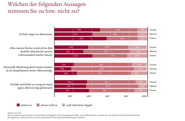 41 % der Frauen und immerhin 31 % der Männer erwarten der Umfrage zufolge, dass sie im Alter ohne ihren Partner deutliche Abstriche machen müssen. Rund 40 % der Befragten gehen davon aus, dass ihr Lebensstandard im Alter sinkt. Wenn das Geld nicht reicht, liegt das bei Frauen häufig daran, dass die Familie Vorrang vor dem Beruf hat: Kindererziehung und die Pflege Angehöriger sind bei 42 % der Frauen der Hauptgrund für zu geringe Rentenansprüche, während nur 14 % der Männer dies als einen Grund dafür nennen.
