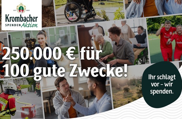 Gesellschaftliches Engagement ist so vielfältig wie unsere Gesellschaft selbst und zeigt sich in unzähligen Formen - sei es in der Unterstützung von Vereinen und Initiativen, im Einsatz für Umwelt- und Klimaschutz, in sozialen Hilfsprojekten oder in kulturellen und sportlichen Angeboten, die unser Miteinander bereichern. Um dies zu würdigen, unterstützt die Krombacher Brauerei auch 2026 wieder 100 Organisationen mit insgesamt 250.000 Euro. Vorschläge können ab sofort eingereicht werden.