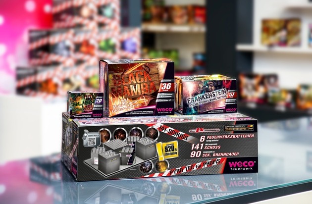 Auch 2015 bietet WECO Feuerwerk für den jährlichen Silvesterverkauf wieder zahlreiche Neuheiten mit Effektvielfalt. Highlights sind Batteriefeuerwerke wie die 36-Schuss starke "Black Mamba": Mit einer Effektmenge von bis zu 500 Gramm und 3-fach abgeschossenen großen Goldweiden-Effekten mit grünen, roten und weißen Sternen kombiniert sie imposante Blinkstern-Buketts in Rot und Gold. Oder die Batterie "Frankenstein": eine weitere imposante 57-Schuss-Batterie mit herrlichen Feuertöpfen in Rot und Grün mit Knatter und schrillem Pfeifen gefolgt von beeindruckenden Blink-Buketts. Aber auch kleinere Batterien mit bis zu 200 Gramm Schwarzpulver wie die neue WECO "Alien" überzeugen in der Silvesternacht. Für ein unvergessliches Erlebnis sorgt das grandiose Verbundfeuerwerk "Pyrotec für Profis": Mit insgesamt 141 Schuss und Verwandlungsbuketts sowie fetzigem Crackling, einer Brenndauer von 90 Sekunden und Effekthöhen von bis zu 40 Metern ist um Mitternacht das Staunen garantiert.